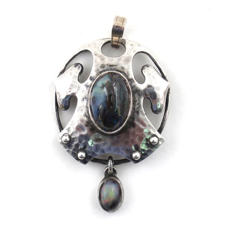 A Murrle Bennett Secessionist silver and opal pendant, circular, pierced and hammered form, with opal drop, stamped MB 950 3cm. high