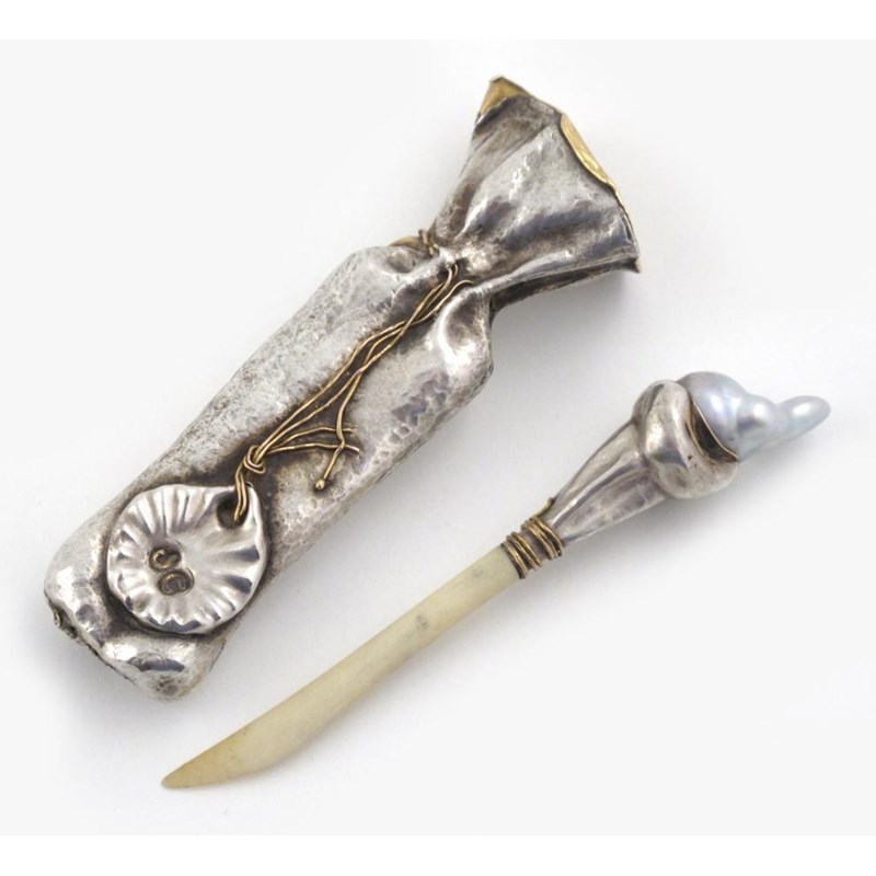 A silver, gold and baroque pearl toothpick by Diane Hobson, the pick with applied Baroque pearl shell finial, with modelled sack sheath, the drawstrings with label stamped JC unsigned 8cm. high