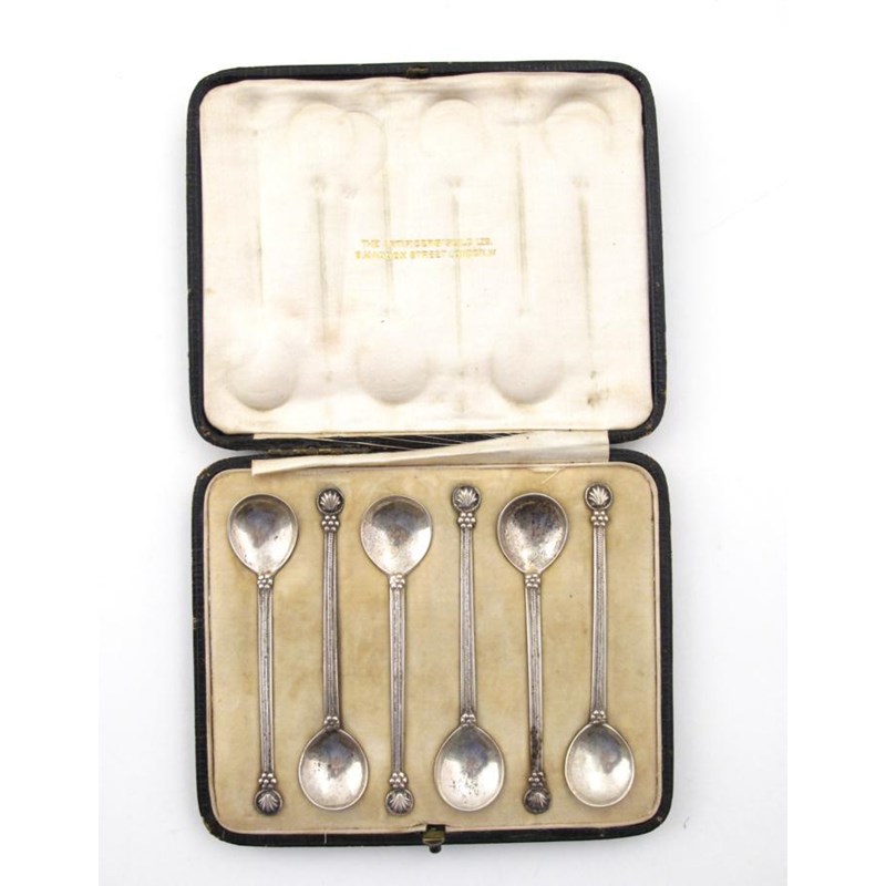 A set of six Artificers Guild silver tea spoons, probably designed by Edward Spencer, each with clam shell terminals, in original fitted case cast stamped The Artificers Guild, spoons unmarked each spoon 9.5cm. long
