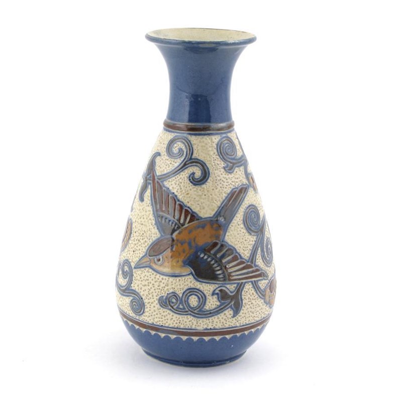 A C H Brannam, Barnstaple vase, by William Baron, dated 1886, tapering flask form with everted rim, incised with a bird before flowering foliage, in shades if green, blue and ochre on a cream ground incised marks to base 22.5cm. high