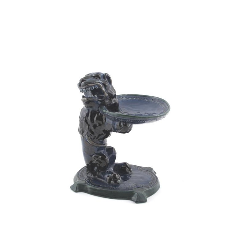 A C H Brannam Pottery figural tazza, dated 1901, by Frank Thomas, modelled as a grotesque standing on hind legs, holding an oval tray glazed in shades of green, blue and brown incised marks, restored 27cm. high