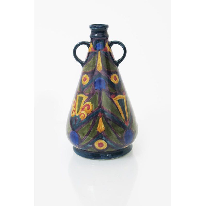 A rare Hancock & Sons Morris Ware vase designed by George Cartlidge, model no.C74-1, carafe form with loop handles, painted with abstract flowers and foliage in shades of blue, purple and yellow ochre, printed factory mark, painted facsimile signature and number, 25cm. high