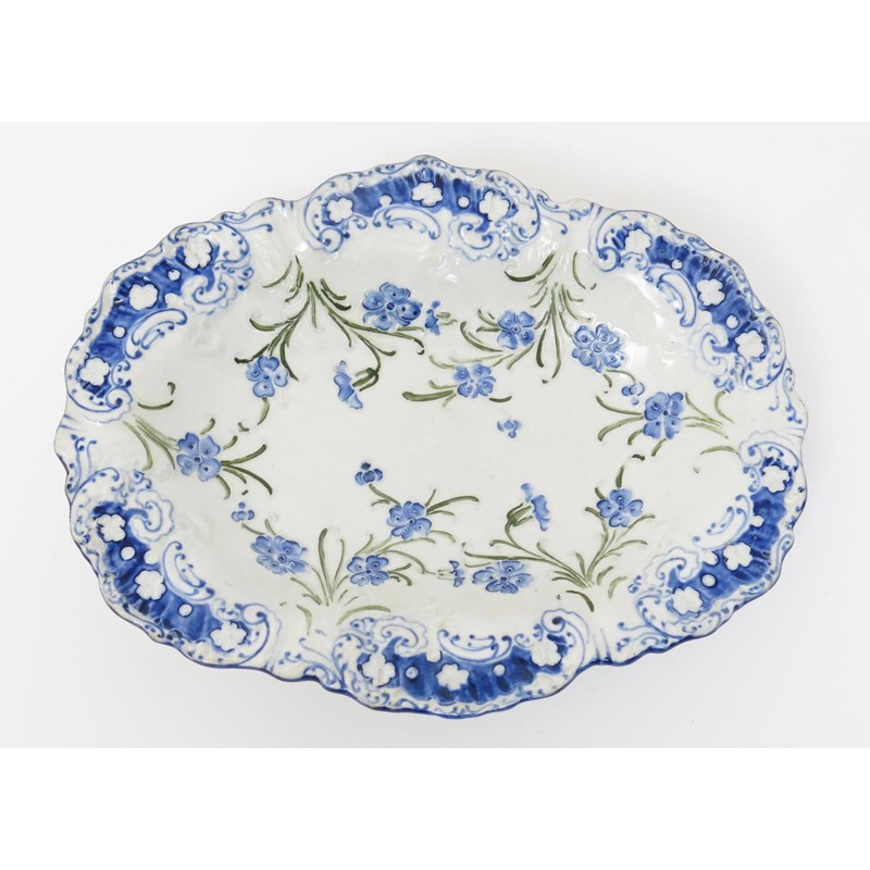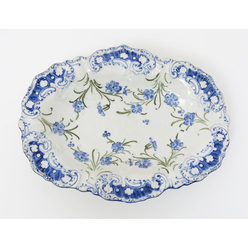 'Du Barry' a James Macintyre dish designed by William Moorcroft, modelled in low relief and tubeline decorated with blue flower stems, in blue and green on a white ground, printed Macintyre mark, professional restoration to rim, 30cm. wide.