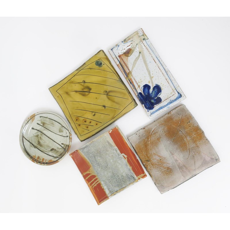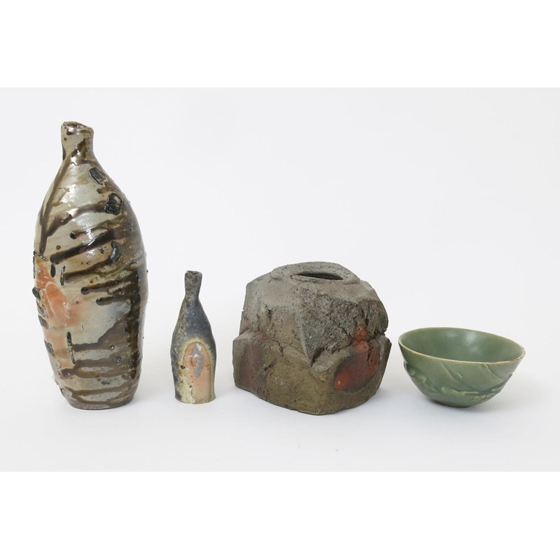 a salt-glaze stoneware bottle vase, slender form with poured ash glaze, glaze imperfections and kiln kisses in the finish, another solifleur vase by John MacKenzie, a stoneware vase by Herve Rousseau, a square dish by Pascal Geoffrey, a bowl by Jean-Francois Foullhoux and five other dishes impressed seal marks, 35cm. high (10)