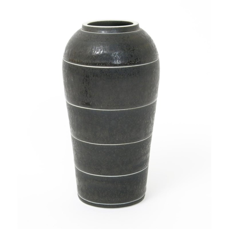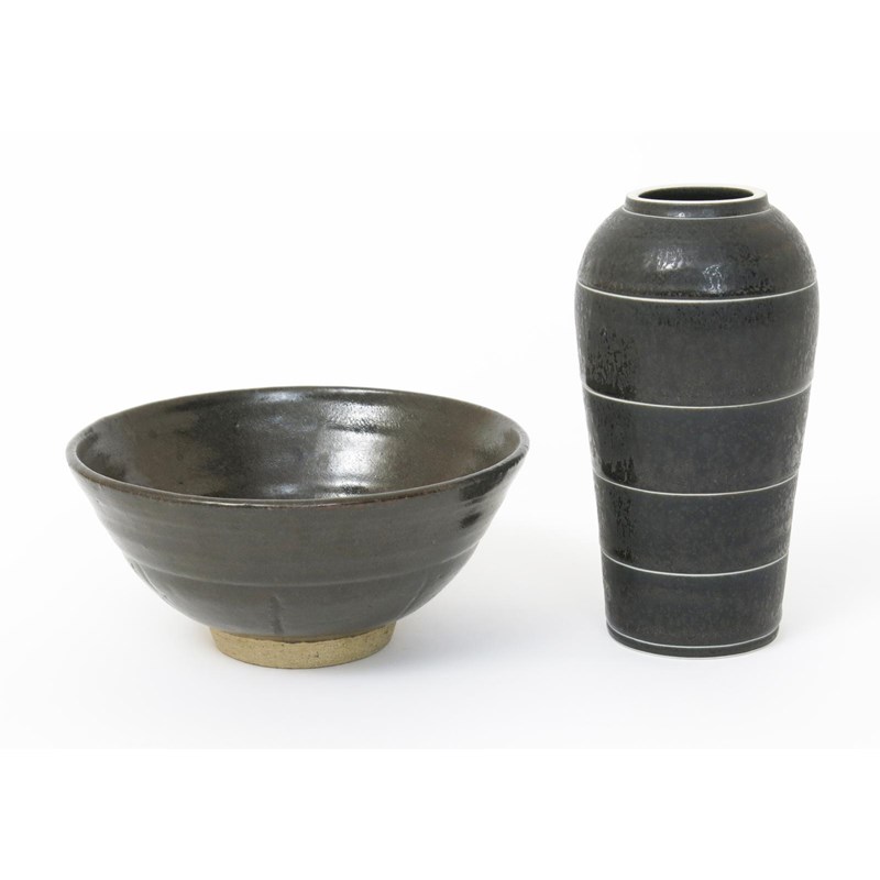 a porcelain vase, shouldered form incised with horizontal bands, glazed black hare's fur, and a stoneware bowl glazed to the foot by Julian Stair, impressed seal mark on rim, 17.5cm. high, (2).