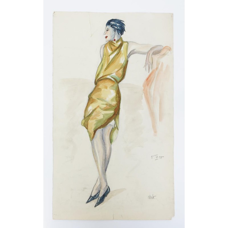 watercolour on paper, the reverse painted with a woman in a yellow dress