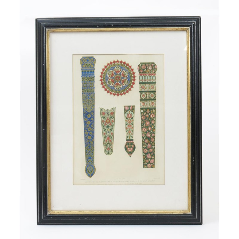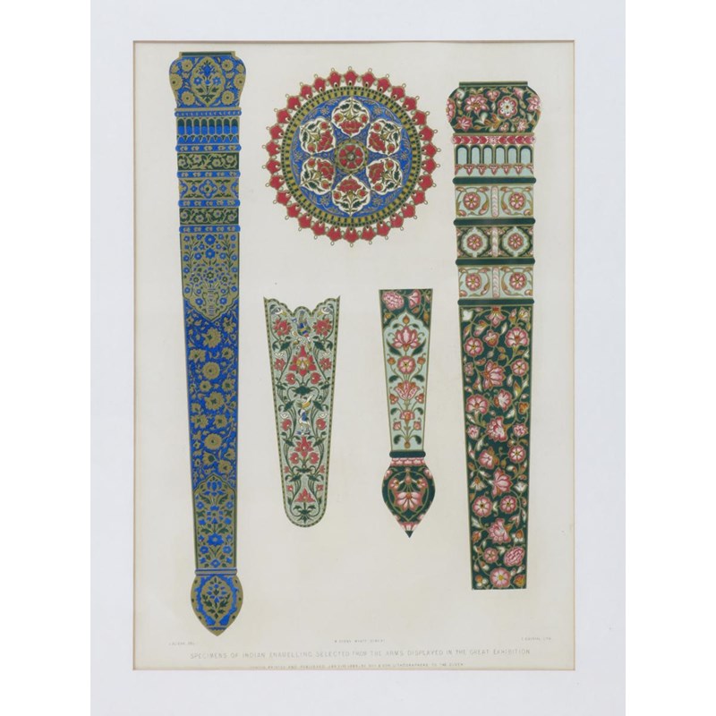 Specimens of Indian Enamelling Selected from the Arms Displayed at the Great Exhibition by Sir Matthew Digby Wyatt, lithograph in colours, printed January 1853 by F Cherval Litho, framed, printed marks to base, 42 x 29cm (image)