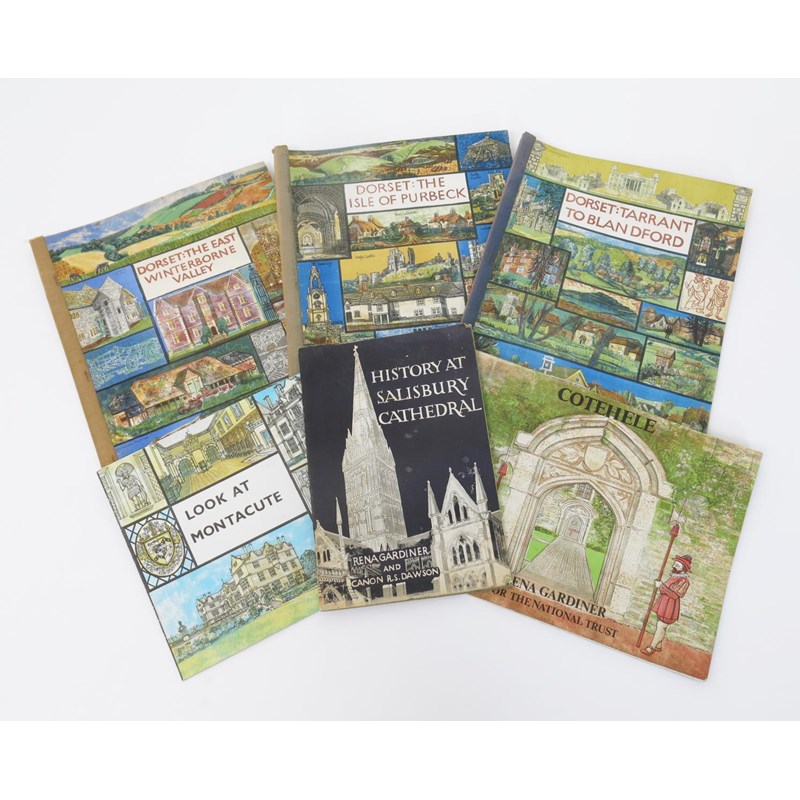 Six hand published books designed and illustrated by Rena Gardiner, comprising; Dorset: and The East Winterborne Valley, 1968, Dorset: The Isle of Purbeck, 1969, Dorset: Tarrant to Blandford, 1970, Cotehele, (second revised edition), 1979, History of Salisbury Cathedral, 1967, Look at Montacute, 1981, (6).