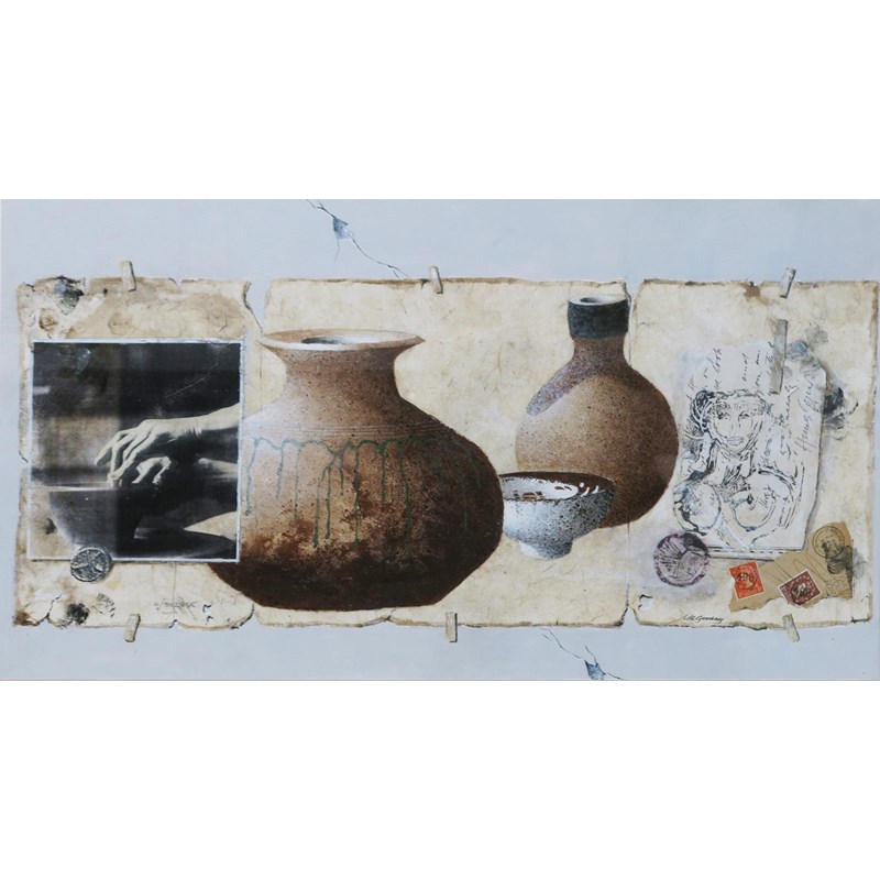 this vase depicts a large Janet Leach pottery vase and a photograph of a potters hands possibly Lucie Rie's.