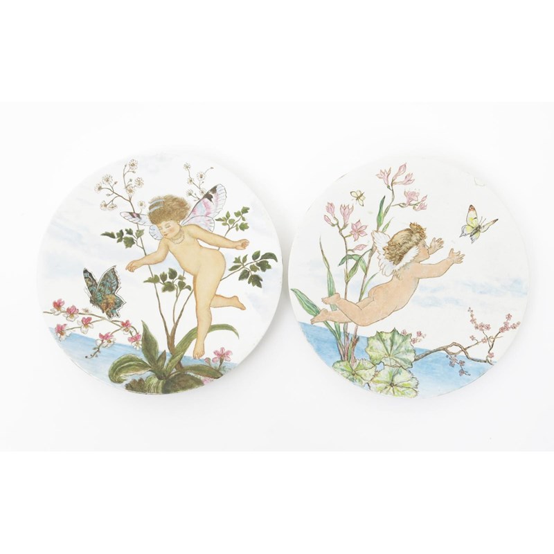 A pair of Minton's Pottery wall plaques the design attributed to W S Coleman, painted with cherubs and butterflies before an expanse of water, in colours on a pale blue ground, impressed marks, painted Mrs Harry to the reverse, repaired chip to rim of one 36cm. diam. (2)