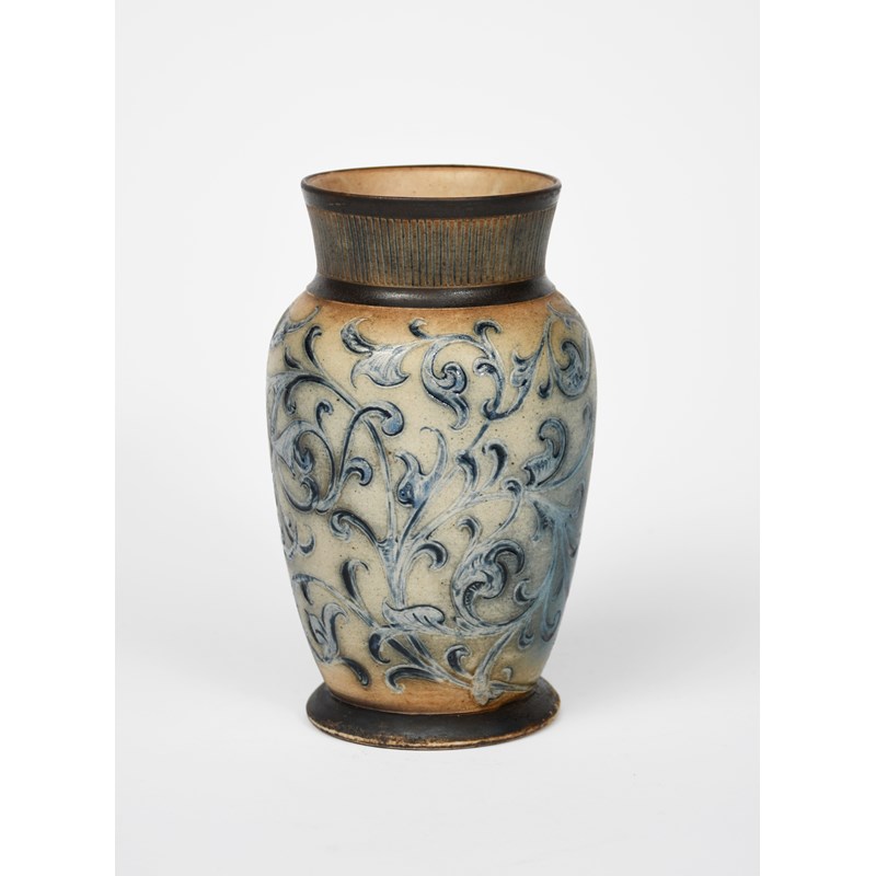A Martin Brothers stoneware vase, dated 1894, shouldered form, incised with scrolling foliage in blue and brown on a buff ground, incised 6-1894 Martin Bros London & Southall, 16cm. high