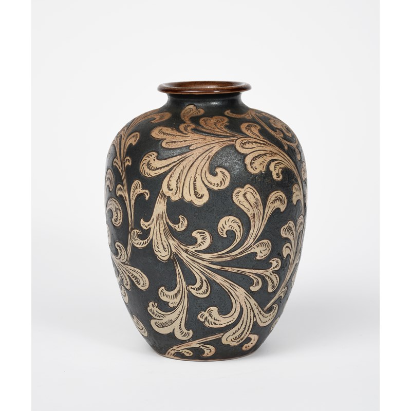 A Martin Brothers stoneware vase, shouldered form, incised with scrolling foliage in buff on a brown ground, incised indistinct date Martin Bros London & Southall, 19.5cm. high