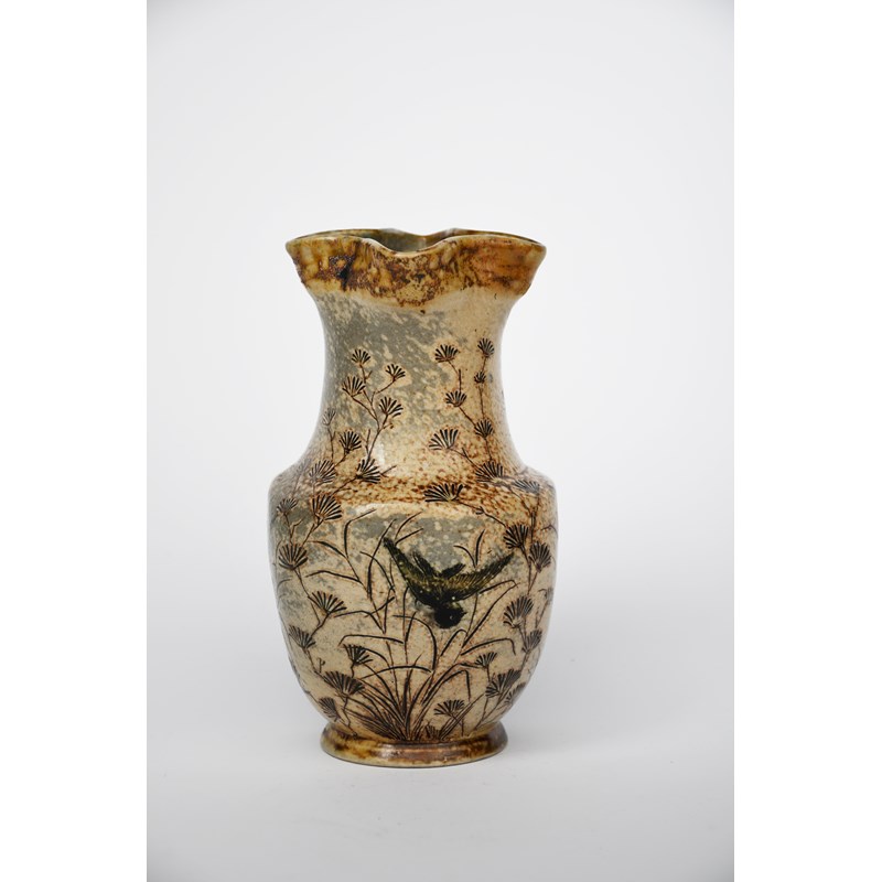 A Martin Brothers stoneware vase, dated 1888, shouldered, square section, with cylindrical neck and pinched rim, incised with birds flying amongst foliage, in grey and brown on a buff ground, incised marks, date indistinct probably 1888, Martin Bros London & Southall, professional restoration to top rim, 20.5cm. high