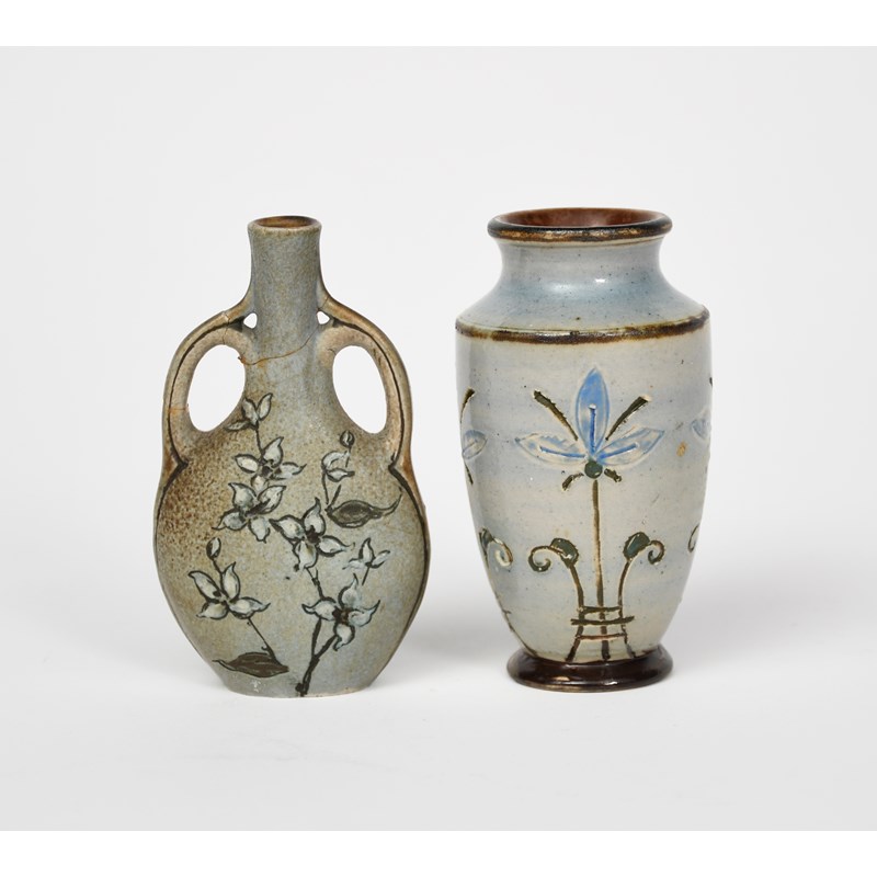 A Martin Brothers stoneware twin-handled vase by Edwin and Walter Martin, dated 1895, slender form, incised and painted with flower sprays in green and white on a pale grey-blue ground, and another vase signed by W F Martin, incised Martin 1895 London, neck repaired, second vase restored,, 8.5cm. high (2)