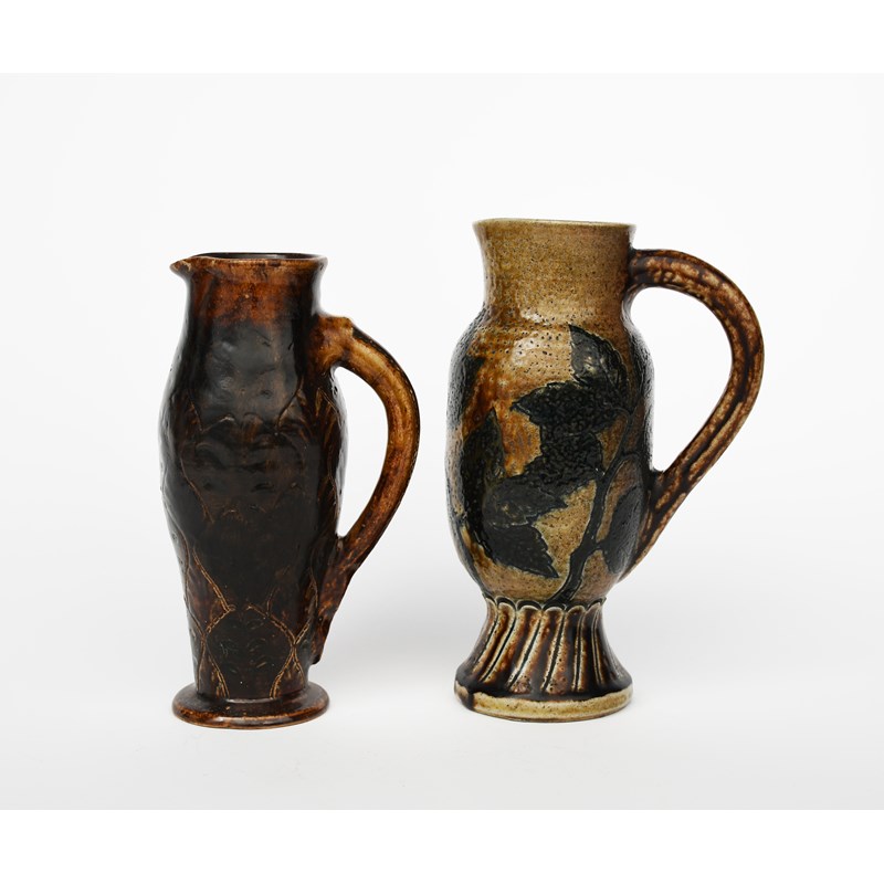 A Martin Brothers stoneware jug by Robert Wallace Martin, dated 1880, shouldered, footed form, incised with simple foliage stems in green on an olive ground, with brown handle, and another jug incised 2.6.80 R W Martin & Bros London & Southall, second jug restored, 25cm. high, (2)