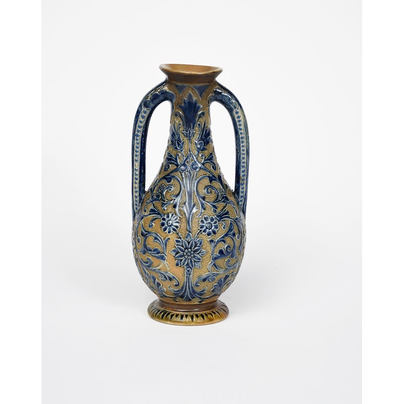 A Martin Brothers stoneware twin-vase by Robert Wallace Martin, incised with scrolling foliage on a textured ground, in blue on a buff ground, incised R W Martin London & Southall, restored neck, 26cm. high