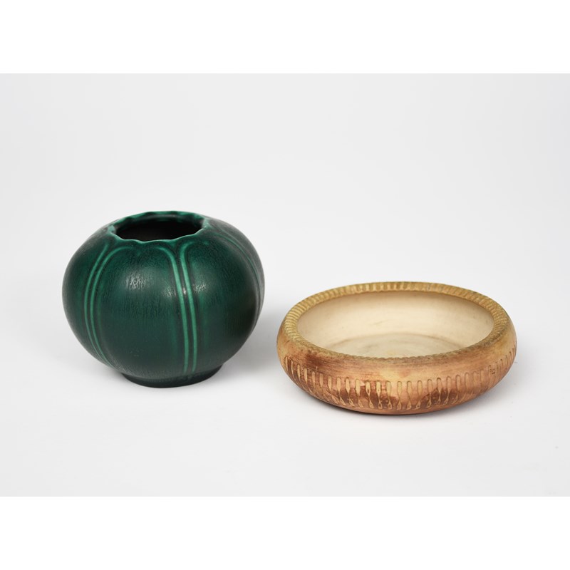 A Martin Brothers stoneware Gourd dish, dated 1895, circular with incised decoration, and a green glazed ovoid vase, incised 1895 Martin Brothers London & Southall, 10cm. diam, (2)