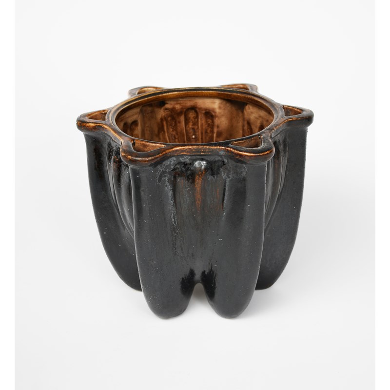 A large Martin Brothers stoneware gourd jardiniere, ribbed form with six aperture to the top, covered in a black glaze, incised regd mark and Southall Pottery, 20cm. high