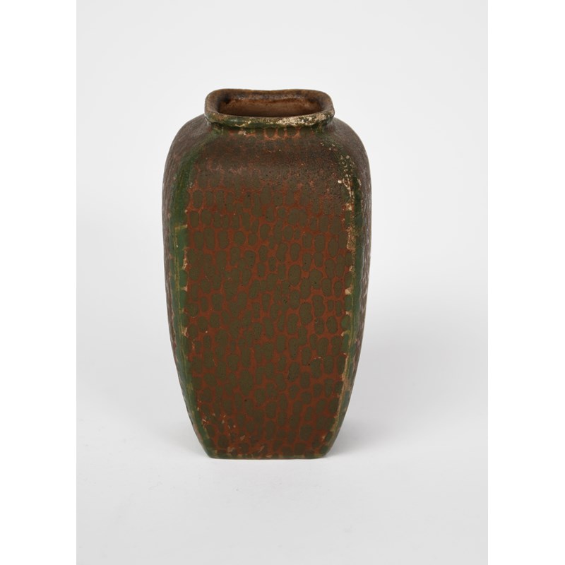 A Martin Brothers stoneware Gourd vase by Edwin & Walter Martin, dated 1911, shouldered square section, painted with green spots and ribs on a brown ground, incised 10-1911, Martin Bros, London & Southall, glaze loss to top rim,11.5cm. high