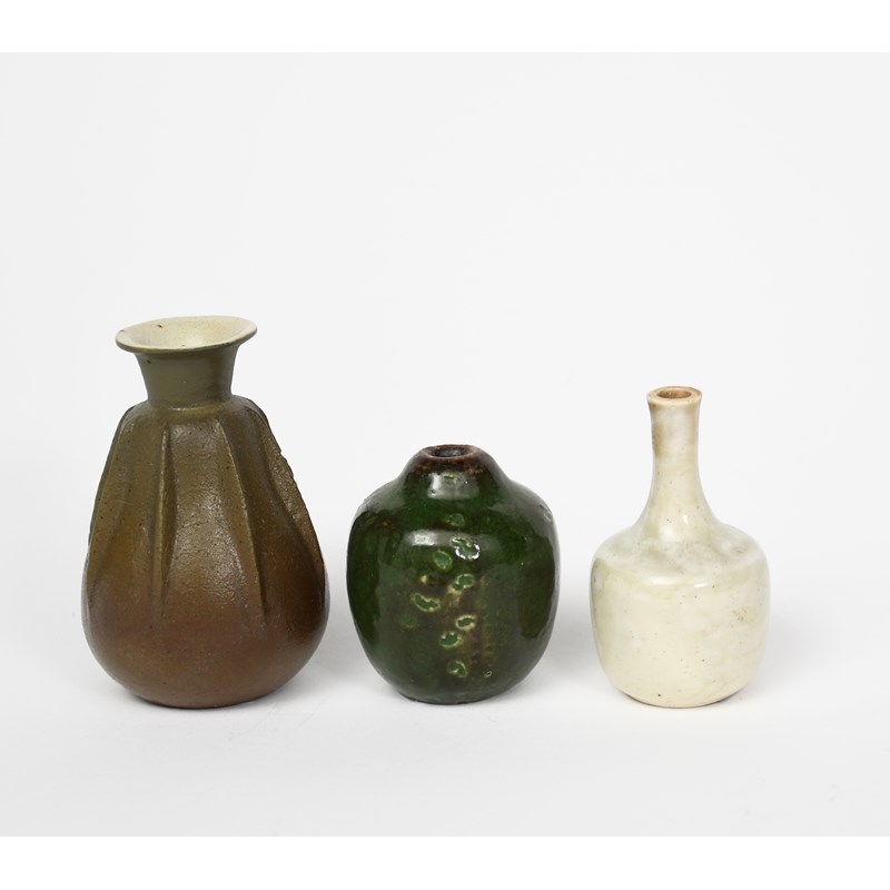 A Martin Brothers stoneware miniature Gourd vase by Edwin and Walter Martin, dated 1906, ovoid form covered in a mottled green and brown glaze, and two other miniature gourd vases, incised 1906 Martin Bros London & Southall, tallest vase restored, 4.5cm. high (3)