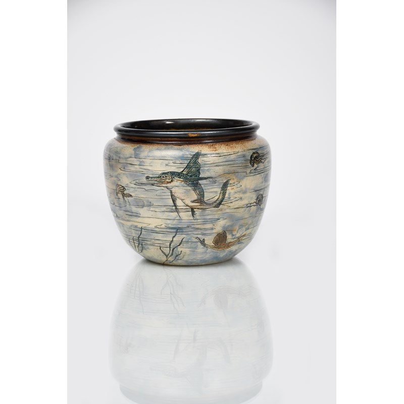 A Martin Brothers stoneware Aquatic jardiniere by Edwin and Walter Martin, dated 1900, shouldered form incised and painted with scaly and grotesque fish swimming amongst snails, jelly fish and a crab, in ochre on a pale blue and buff ground, incised 9 1900 Martin Bros London & Southall, professional restoration, 16.5cm. high
