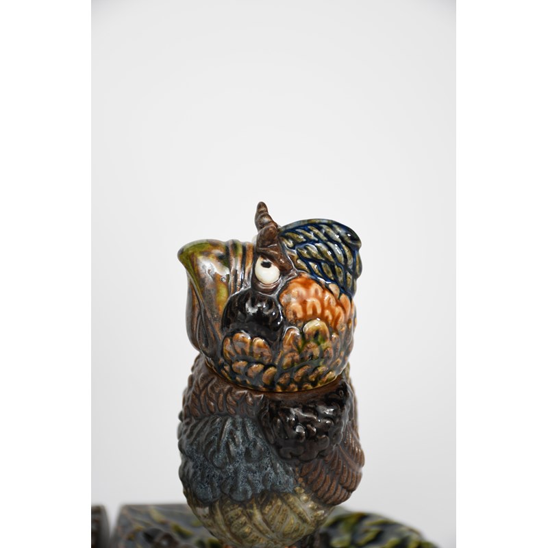 a pair of bird jars and covers, glazed in colours,