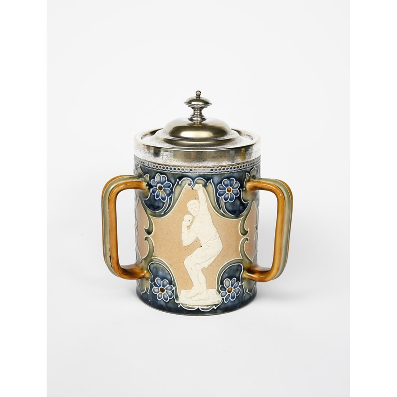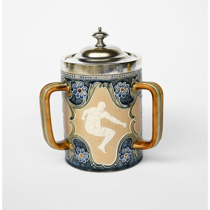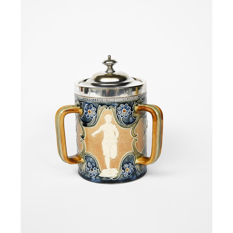 A Doulton Lambeth stoneware tyg, cylindrical form with applied handles, the body applied with sporting figures of a runner, long jumper and a shot-putter, each in tubelined border and flowers, in shades of blue, green and white on a buff ground, with electroplated mount and cover, impressed marks, 19.5cm. high (2)