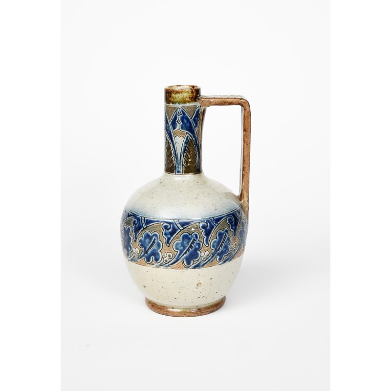 An early Martin Brothers single-handled vase by Robert Wallace Martin, dated 1878, ovoid with cylindrical neck and angled handle, incised with a band of leaves to the body and neck, glazed in blue and brown on a buff ground, incised R W Martin, Southall, 1878, 25cm. high