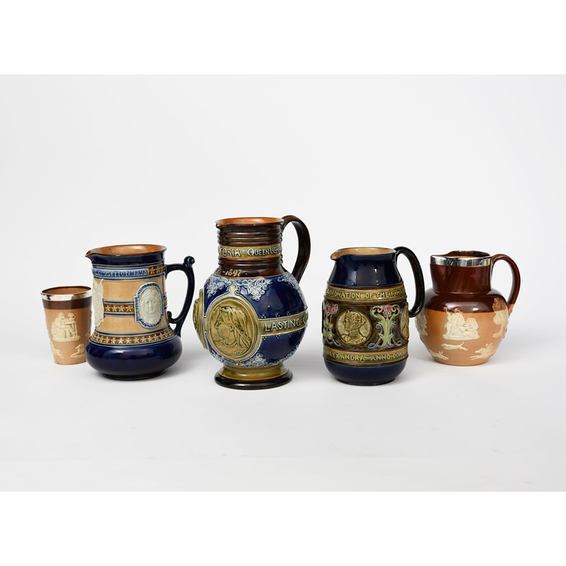 'World's Columbian Exposition 1893' a Doulton Lambeth stoneware commemorative jug by Bessie Newberry, cylindrical form with swollen base, applied with portrait's of George Washington and Christopher Columbus flanking the American Eagle, between applied bands of star decoration, in blue and brown on a buff ground, a Doulton Lambeth Queen Victoria 1837-1897 commemorative jug, a Royal Doulton Lambeth Edward VII Coronation jug a Doulton sprigged water-jug and beaker, impressed marks, incised artists marks, 18.5cm. high (Exposition jug), (5)