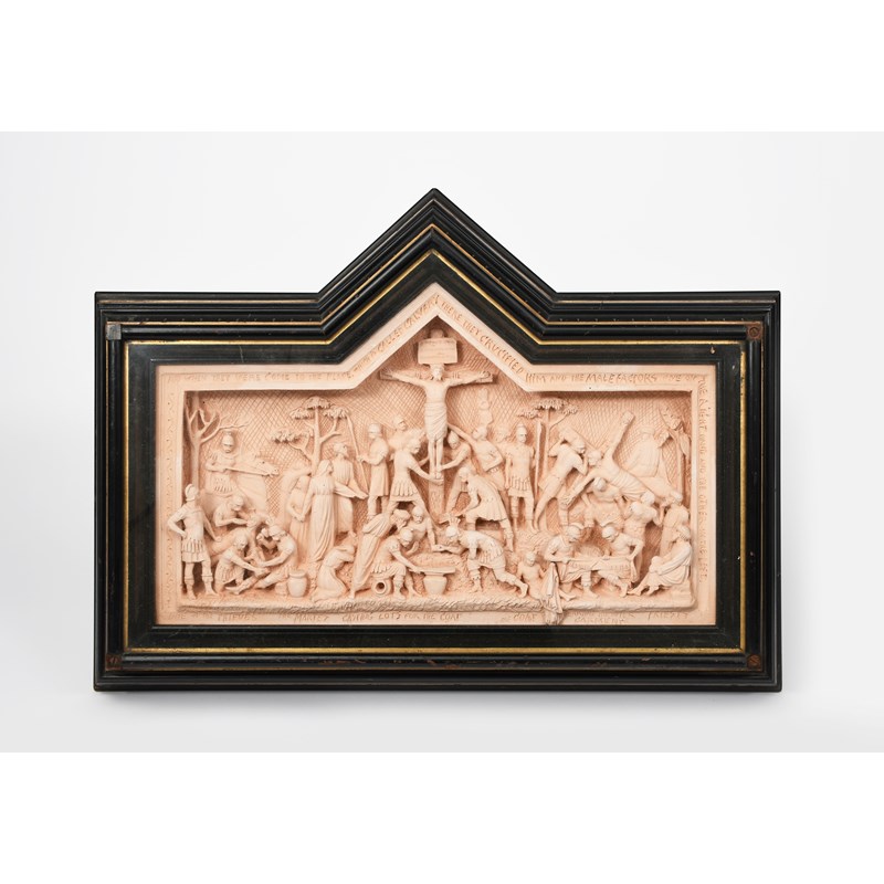 A large Doulton Lambeth terracotta maquette for York Minster by George Tinworth, shaped, rectangular panel, modelled with the Crucifixion of Christ, with white highlighter, incised inscription to border, in original ebonised wood frame with gilt, factory marks probably concealed under frame, 52 x 33cm.