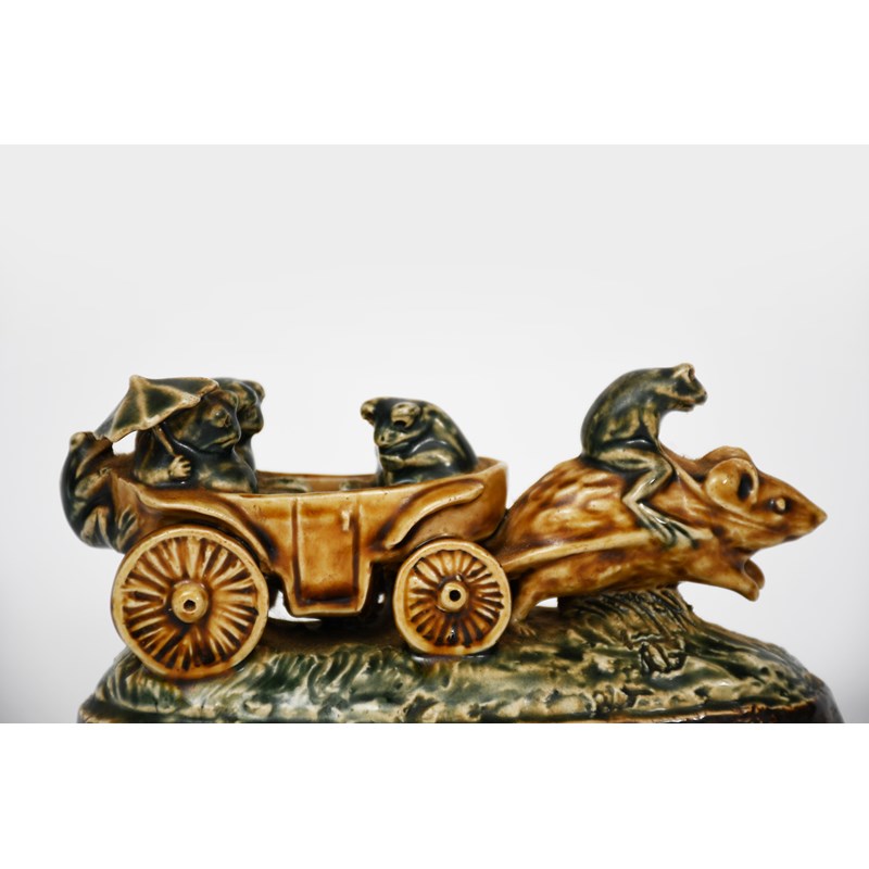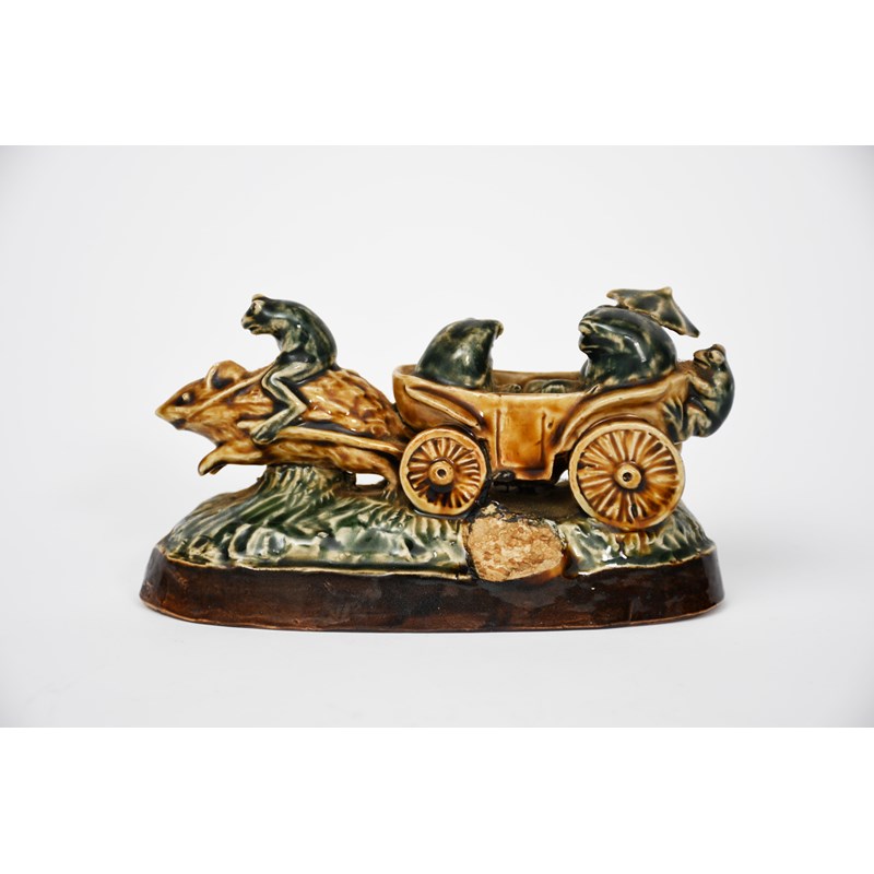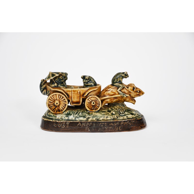 Lost and Serves them Right for Betting (Returning from the Derby) a Doulton stoneware mouse and frog group by George Tinworth, modelled as a large mouse pulling a carriage with four frogs in, a large frog riding the mouse, incised to the base rim 'Lost and serves them right for betting', glazed green, buff and brown, incised GT monogram, signpost off and missing, 15.3cm. wide
