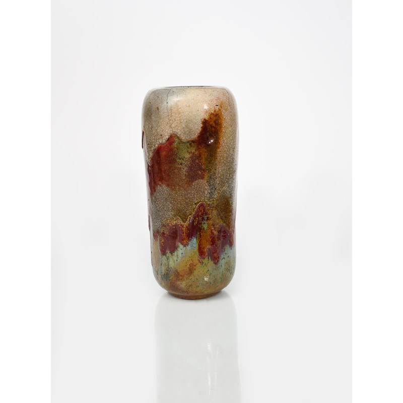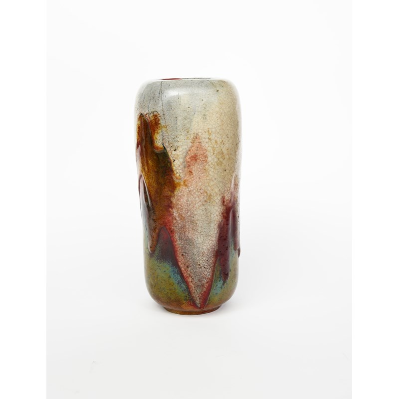 A tall Royal Doulton Chang vase by Charles Noke and Harry Nixon, footed, cylindrical form with inverted rim, covered in a running volcanic glaze, green, yellow and flambe, under a thick white cracked glaze, painted marks and monograms to base, stress hairlines to neck, 43.5cm. high
