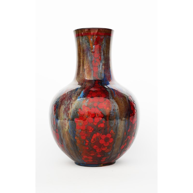 A large Royal Doulton Sung vase by Charles Noke, ovoid with cylindrical neck, painted with prunus blossom, in ruby flambe under streaked blue and lavender, impressed Doulton mark, painted Sung and Noke signature, original paper label, 33cm. high