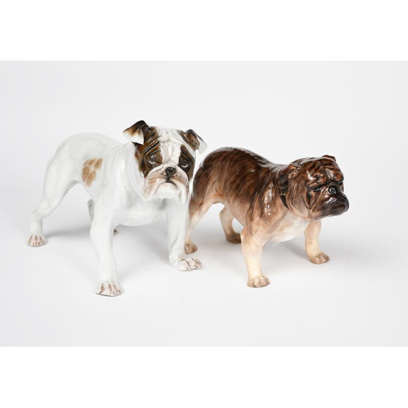 'Standing Bulldog' HN.1043 a Royal Doulton porcelain figure designed by Frederick Daws, painted in colours, and a Rosenthal model of a standing bulldog printed and painted marks, stress crack to Doulton figure, 17.5cm. wide (2)