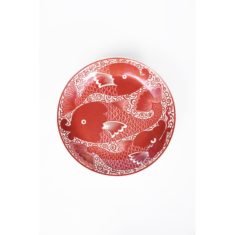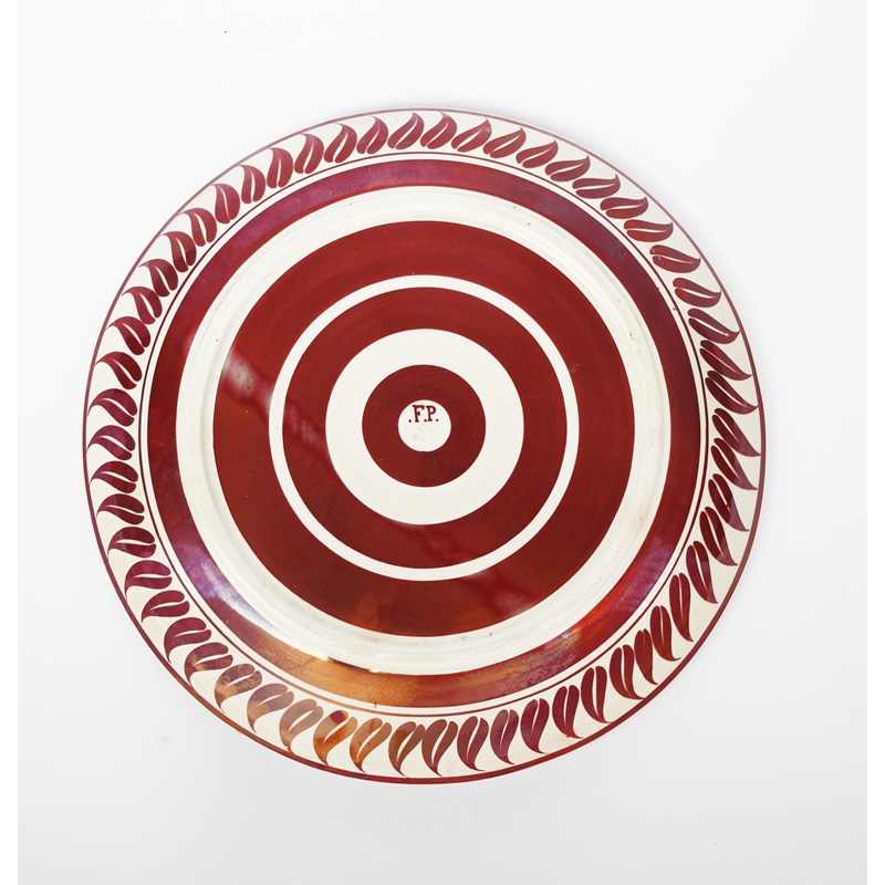 A William De Morgan charger by Fred Passenger, painted with three comical scaly fish, swimming amidst scrolling water-weed, in ruby lustre on a white ground, painted FP, monogram, 36cm. diam.