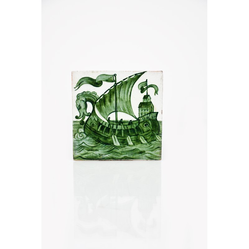 An early William De Morgan Chelsea Period Galleon tile, painted with a ship at sail with three sailors rowing, painted in green on a white ground, impressed factory mark, 15.2cm. square