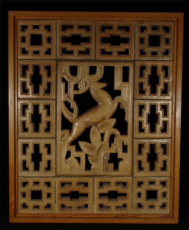 A rare Poole Pottery 'Leaping Gazelle' pierced architectural panel probably designed by John Adams, originally for the Tea Rooms at Poole Pottery, pierced panel inside abstract border, this example manufactured for Brantwood house, Poole 77 x 62cm.