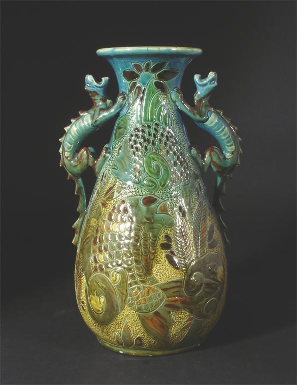 A C.H.Brannam pottery vase by Frederick Braddon dated 1903, applied with twin reptile handles, the body incised and painted with scaly fish, in colours incised marks, minor glaze nicks 29.5cm. high