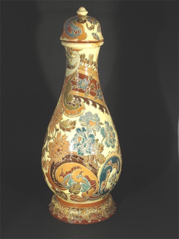 A tall Lauder Barum terracotta vase and cover incised and painted with scrolling flowers and foliage on a pale yellow ground incised lauder Barum, damages 66cm. high