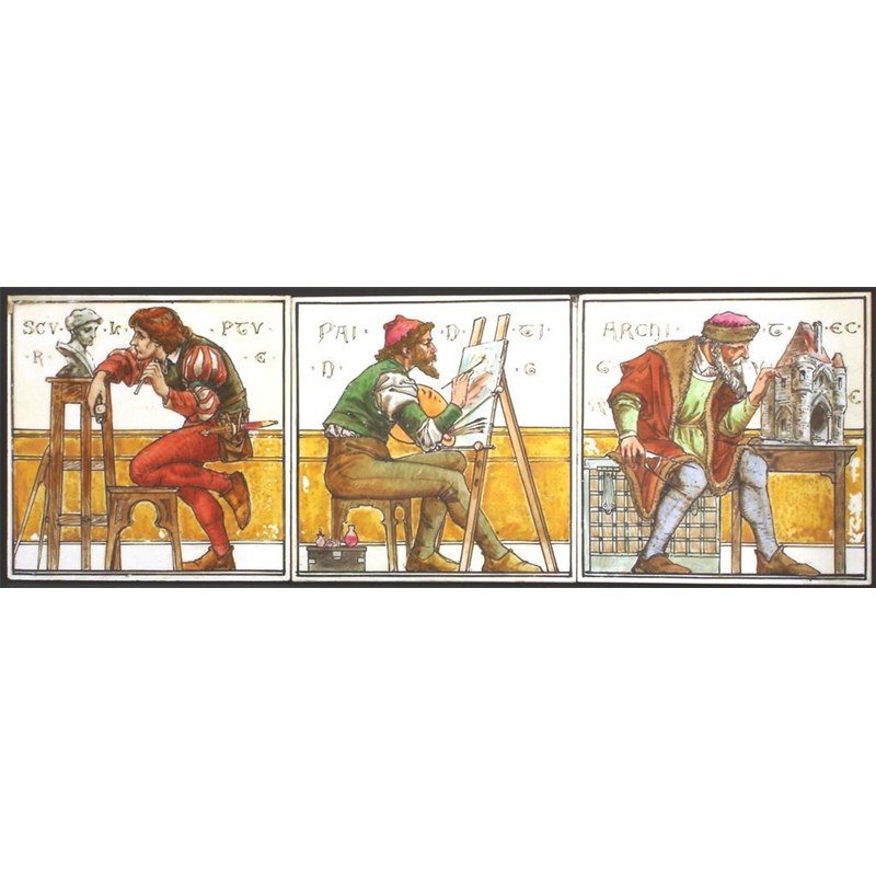 Five Shrigley & Hunt tiles depicting; Sculpture, Painting, Architecture, Music, and Metalwork, each painted in colours painted monogram to three, minor rim chips and paint loss 15.5 x 15.5cm.