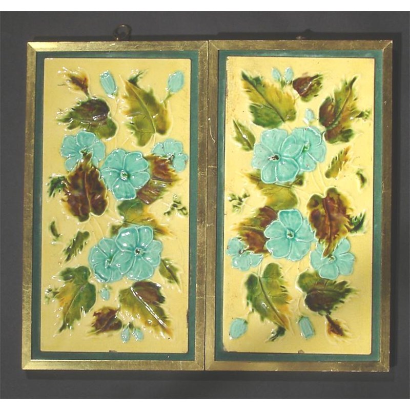 A pair of Burmantoft's Faience tiles modelled in low relief with flower stems in shaded of blue and green on a yellow ground, framed marks concealed 30.5 x 15.5cm.