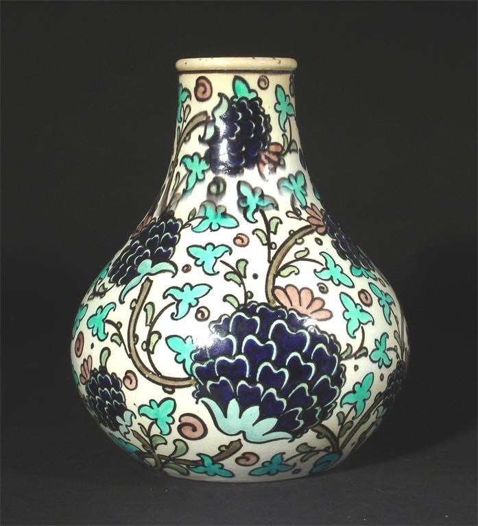 A Burmantoft's Faience Persian vase by Leonard King, painted with scrolling flowers and foliage in shades of blue, green and aubergine on a white ground impressed marks, painted marks, hairlines 24.5cm. high