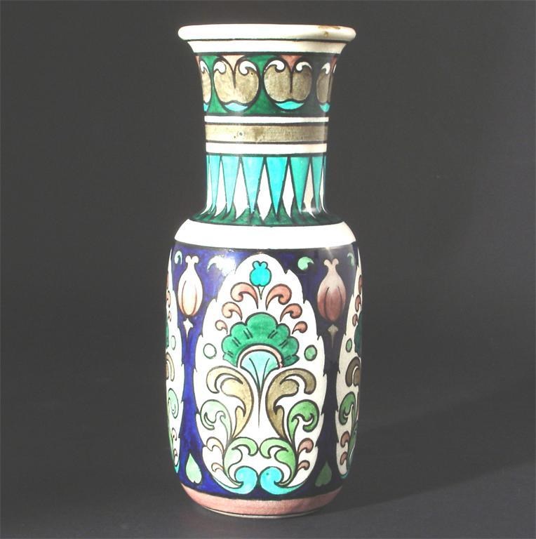 A Burmantoft's Faience Persian vase shape no.168, by Leonard King, painted with flower panels in shades of blue and green on a white ground impressed and painted marks, LK monogram, glaze chips to top rim 23.5cm. high