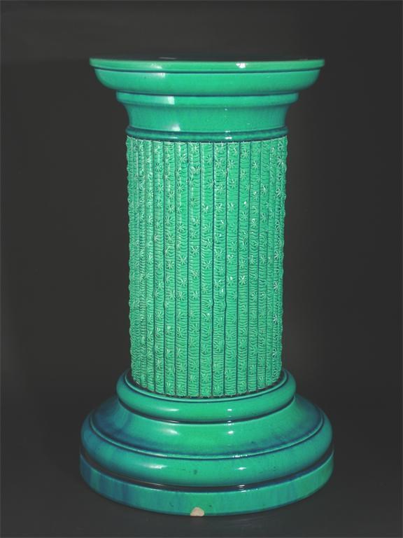 A Burmantoft's faience jardiniere stand model no. 1201, cylindrical form, modelled in low relief with geometric design, glazed blue impressed marks, minor chips 60cm. high