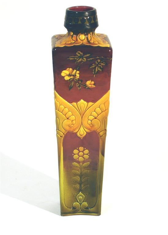 A large Bretby pottery floor vase flaring square section modelled and painted with stylised flower panels, in colours impressed marks, restored top rim 70cm. high