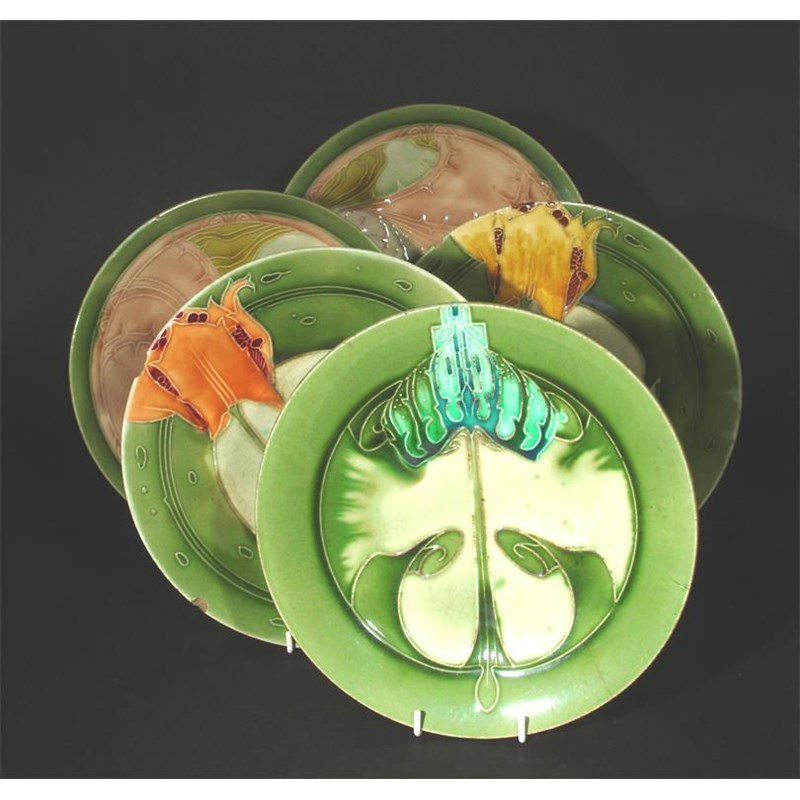 Five various Minton Secessionist plates designed by John Wadsworth, each decorated in colours impressed marks, damages 23cm. diam.