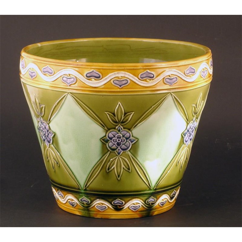 A Minton Secessionist jardiniere designed by John Wadsworth, flaring conical form in shades of purple, green and ochre printed marks, damages 23cm. high