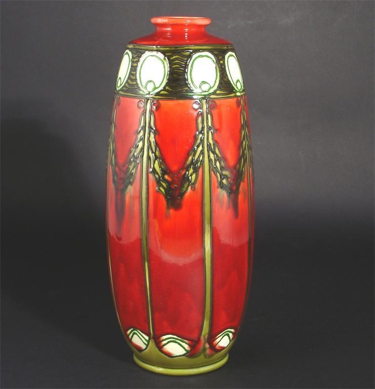 A Minton Secessionist vase designed by John Wadsworth and Leon Solon, tubeline decorated with flower swags in shades of green on a red ground printed and impressed marks 32cm. high