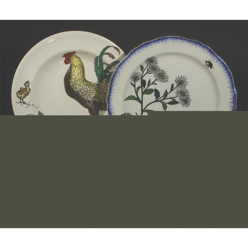 A Minton & Co earthenware plate designed by William S Coleman, printed and painted in colours with a cockerel, a pierced bowl similar and three E Rouseau plates by Felix Bracquemond printed marks, damages 24.5cm. diam.