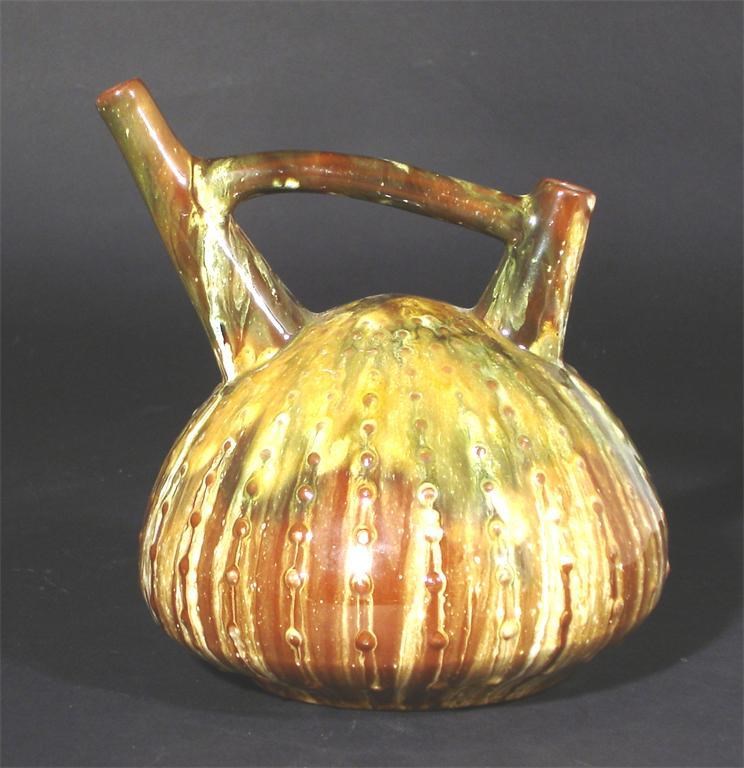 A Linthorpe Pottery ewer designed by Dr Christopher Dresser, model no.312, sea urchin form with pulled spout and handle, glazed green and brown impressed factory mark, facsimile signature 17cm. high